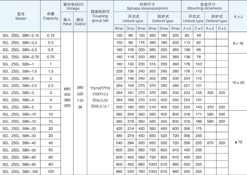 我公司多年来采用优质材料和先进的工艺技术专业生产160VA到600KVA之间,SG、ZSG、SBK系列三相干式(整流)变压器,是我公司参照西门子公司同类产品最新研制开发数控系统用变压器,尤其160VA- 16KVA之间的三相干式变压器,它们的外形和安装尺寸已经标准化,与西门子4AP系列通用,产品符合VDE0550、IEC439、JB5555、GB226等国际、国家标准。