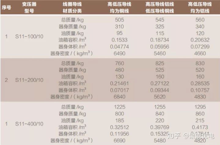 通过下表可以看出,高低压绕组全部是铝的变压器比全铜变压器总质量还高出55公斤,这主要是因为其器身重量、油的重量、油箱重量、器身体积等都增加了。而高压导线为铝线,低压导线为铜线的变压器也是相同的道理。
